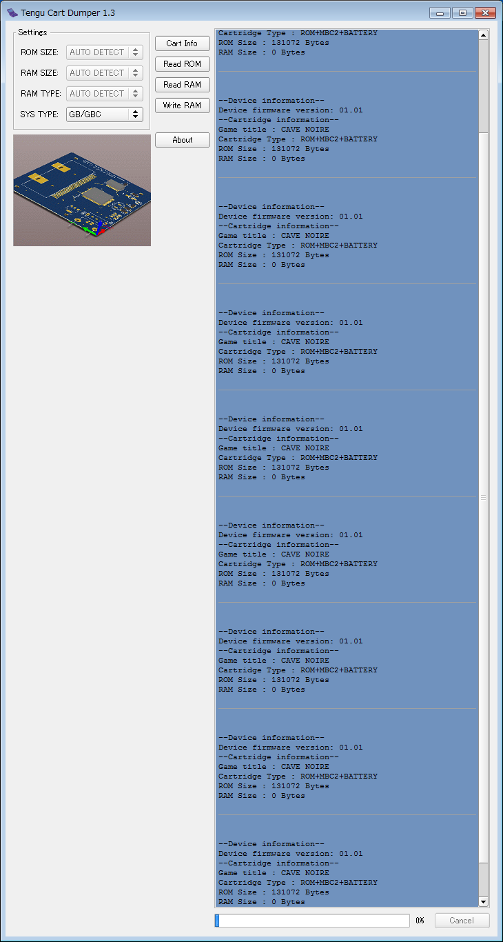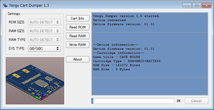 --Device information-- Device firmware version: 01.01 --Cartridge information-- Game title : CAVE NOIRE Cartridge Type : ROM+MBC2+BATTERY ROM Size : 131072 Bytes RAM Size : 0 Bytes 0 Bytes……!? このゲームにもセーブ要素はあるので、非対応ということでしょうか。 何度抜き差ししても、接点復活スプレーを使っても同様だったので、接続に問題はないと思います。