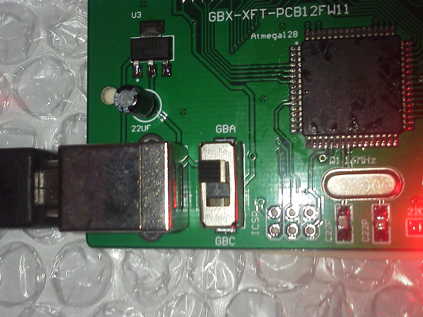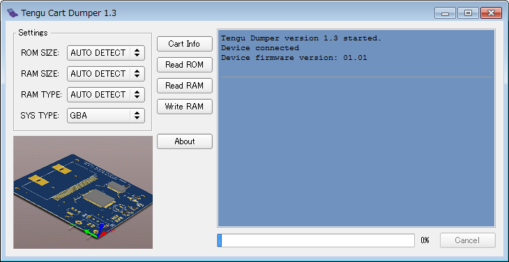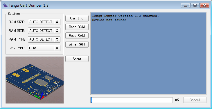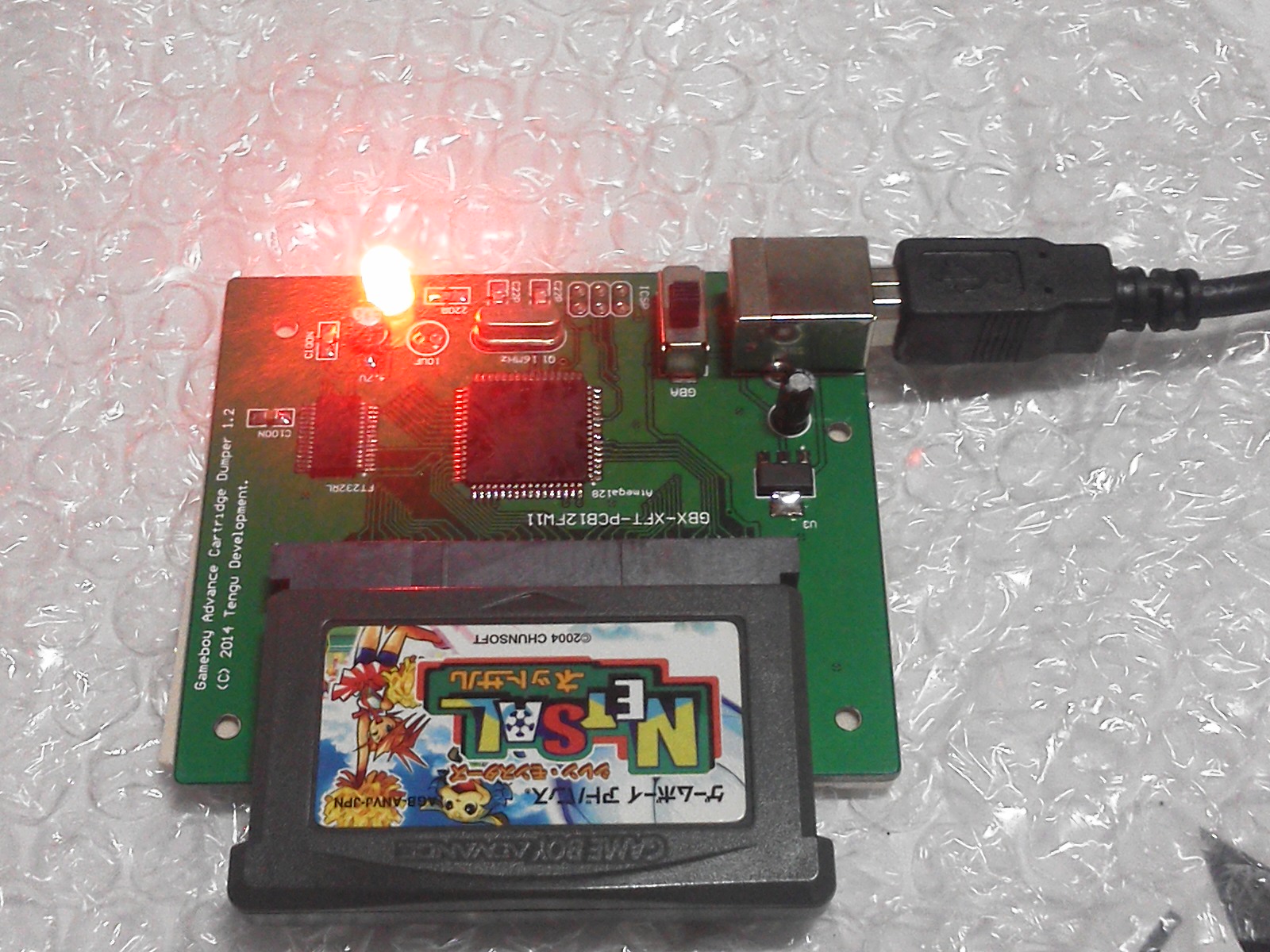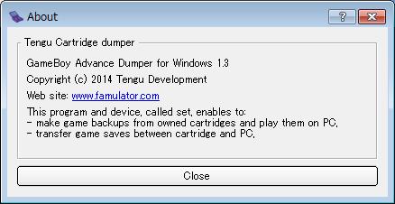 ケーブルを接続するとこう点灯します。 製品名に「V」はつきません。製品名をよくご確認ください。 ━━━━━━━━━━━━━━━━━━━━━━━━━━━━━━━━━━━━━━━━━━━━━━━━━━━━━━━━━━━━ 【前提環境】 手元には、 ◆GBAダンパー(機器) ◆GBAダンパー用ケーブル(購入時に付属) ◆(パソコン内)GBAダンパーを操作するためのアプリケーション。1.3 がそろっていることを前提としています。 アプリケーションは「Tengu - GBA Dumper 1.3 Alpha.exe」を使います。 このアプリケーションのファイルサイズは「2.85 MB (2,989,056 バイト)」、なおかつ アプリケーションを起動してAboutをクリックしたときに、これと全く同じ画面が出れば、私と同じ環境です。