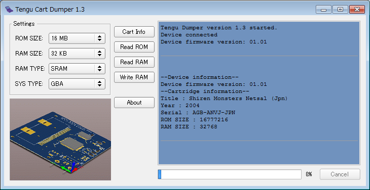 --Device information-- Device firmware version: 01.01 --Cartridge information-- Title : Shiren Monsters Netsal (Jpn) Year : 2004 Serial : AGB-ANVJ-JPN ROM SIZE : 16777216 RAM SIZE : 32768 これは、ゲームボーイアドバンス対応ゲームカートリッジ「シレン・モンスターズ NETSAL」を 正しく読み込めたときに出てくるメッセージです。 私はネットサルを2本持っていて、2本とも同じ結果でした。 他のゲームの「Cart info」結果もおいておきます、