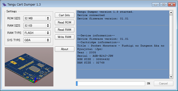 --Device information-- Device firmware version: 01.01 --Cartridge information-- Title : Pocket Monsters - Fushigi no Dungeon Aka no Kyuujotai (Jpn) Year : 2005 Serial : AGB-B24J-JPN ROM SIZE : 33554432 RAM SIZE : 32768